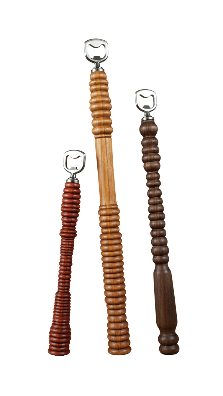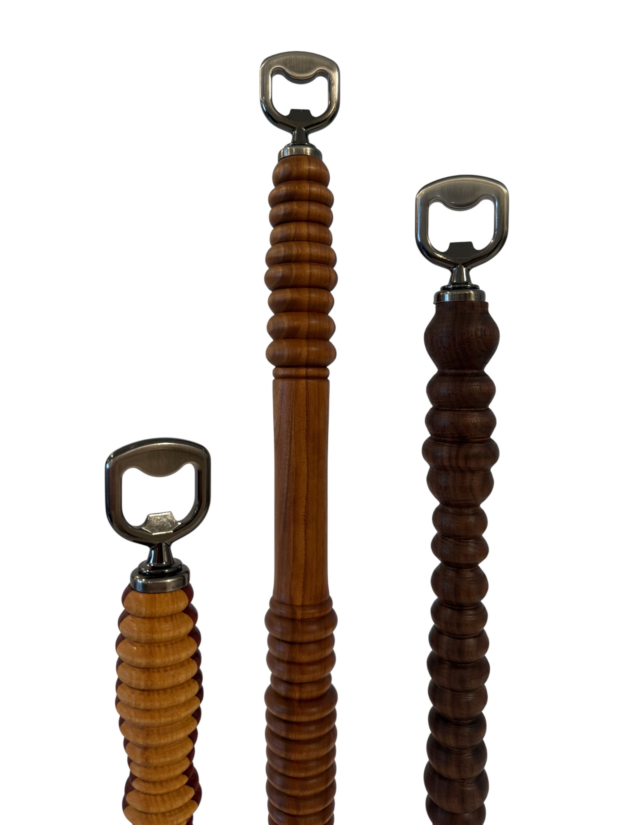 The bottle poppers are handcrafted from hand-picked solid wood. Chosen with strength, durability, and beautiful grain patterns in mind. Each piece is unique.